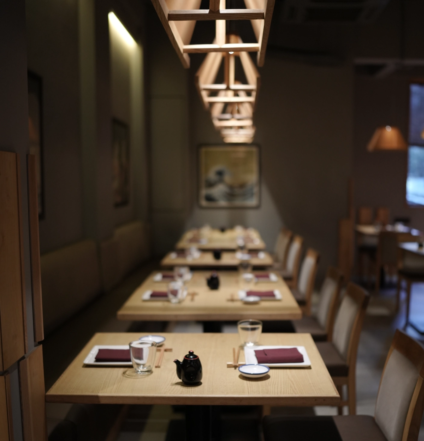 A serene, thoughtfully designed space inspired by Japanese aesthetics, offering an intimate and refined dining environment.